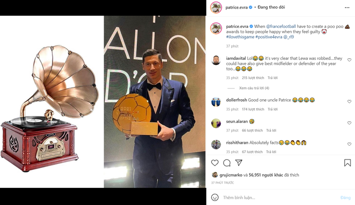 Ở phần mô tả, Evra viết: “France Football vừa phải tạo ra một danh hiệu như bãi phân để giữ cho mọi người cảm thấy hạnh phúc khi họ cảm thấy mình có lỗi”, kèm theo biểu tượng hình cục phân. Cựu hậu vệ người Pháp cũng nhắc đến tài khoản Instagram của France Football và Lewandowski trong bài đăng của mình.