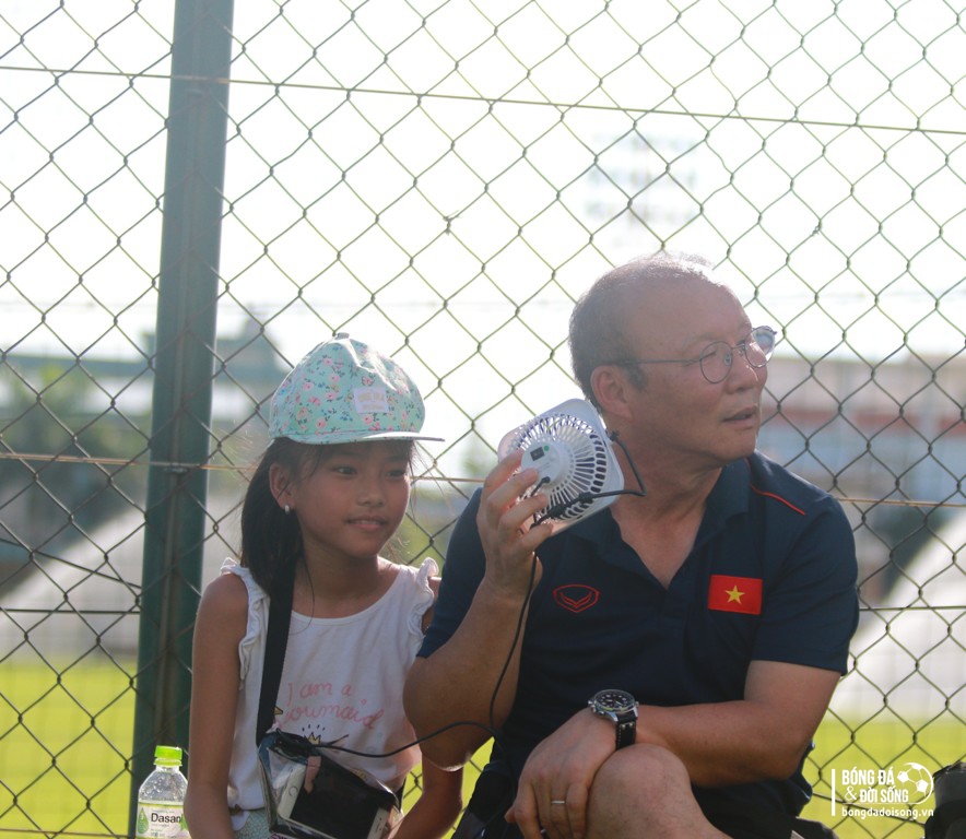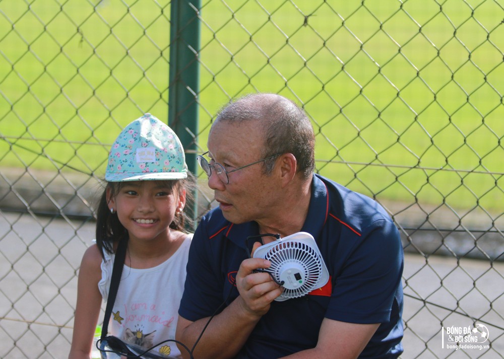 Một cô bé trong lúc đợi bố thi đấu đã cho thầy mượn chiếc quạt mini