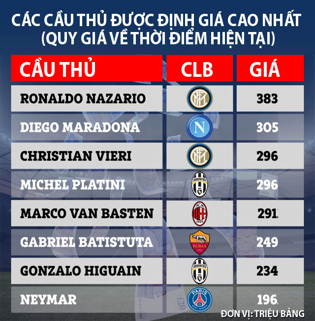 Cụ thể, trang Play Ratings đã tiến hành tính toán lại, cộng thêm cả lạm phát để cho ra giá trị chuyển nhượng chính xác nhất theo tỷ giá hiện tại. Lúc này, Neymar vẫn là cầu thủ đắt giá nhất giới với 196 triệu bảng khi rời Barcelona gia nhập PSG vào mùa Hè 2017.
