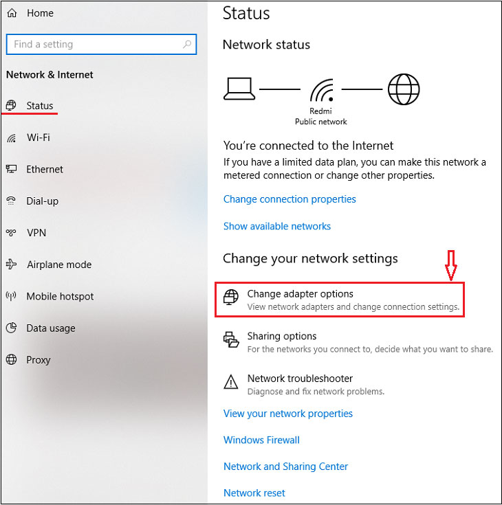 Bước 2: Đi đến mục Status > Chọn vào Change adapter options.