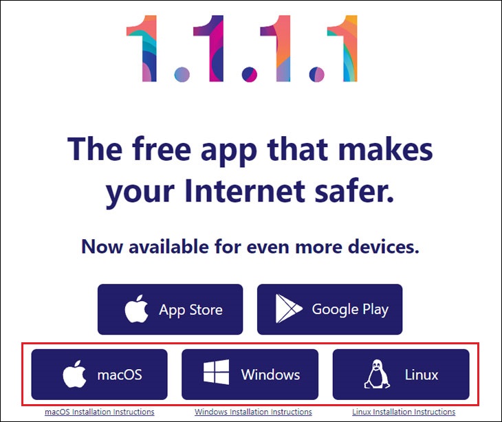 Bước 1: Truy cập vào trang 1.1.1.1, chọn và tải về phiên bản phù hợp với máy tính của mình: macOS, Windows và Linux.